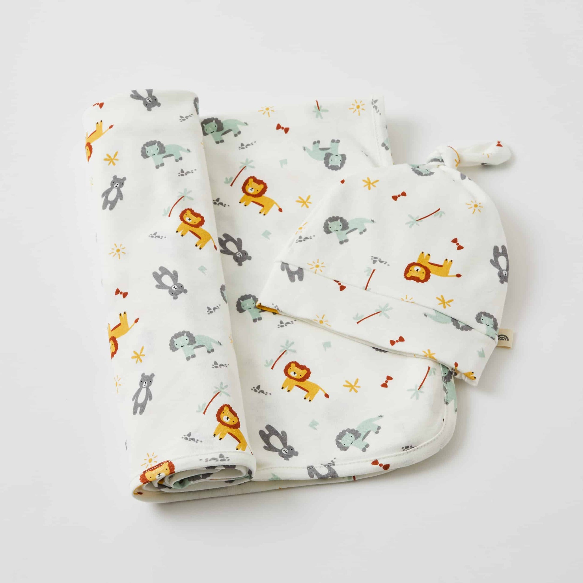 This 100% Cotton Jersey baby blanket with knotted beanie is perfect for keeping little ones warm when heading out on those cooler days. Lightweight and breathable, the wrap can also be used to drape over the pram while baby sleeps. Beautifully packaged in a display box with acetate lid, this set is a perfect gift for expecting parents.