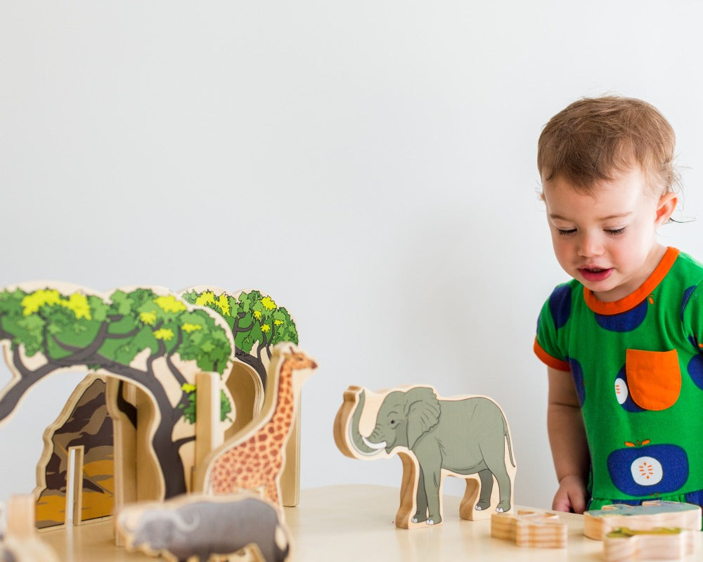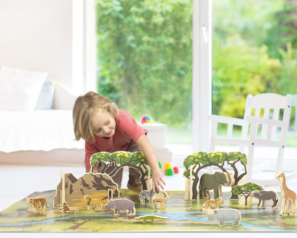 This high-quality wooden animal set includes mountains and trees brilliant for building your own wild playscape. The set comprises of 2 wooden arched trees, a mountain range, a wooden tree as well as 12 beautifully illustrated animals (Tiger, Lion, Zebra, Monkey, Crocodile, Giraffe, Gazelle, Buffalo, Elephant, Rhino, Leopard and Hippo). It is great playscape setup that encourages imaginative open-ended play while learning all about the wild animals and also promotes social development through role-playing. The beautifully illustrated images are printed using non-toxic heat transfer technology and sealed with a clear matte varnish to ensure long-lasting quality.