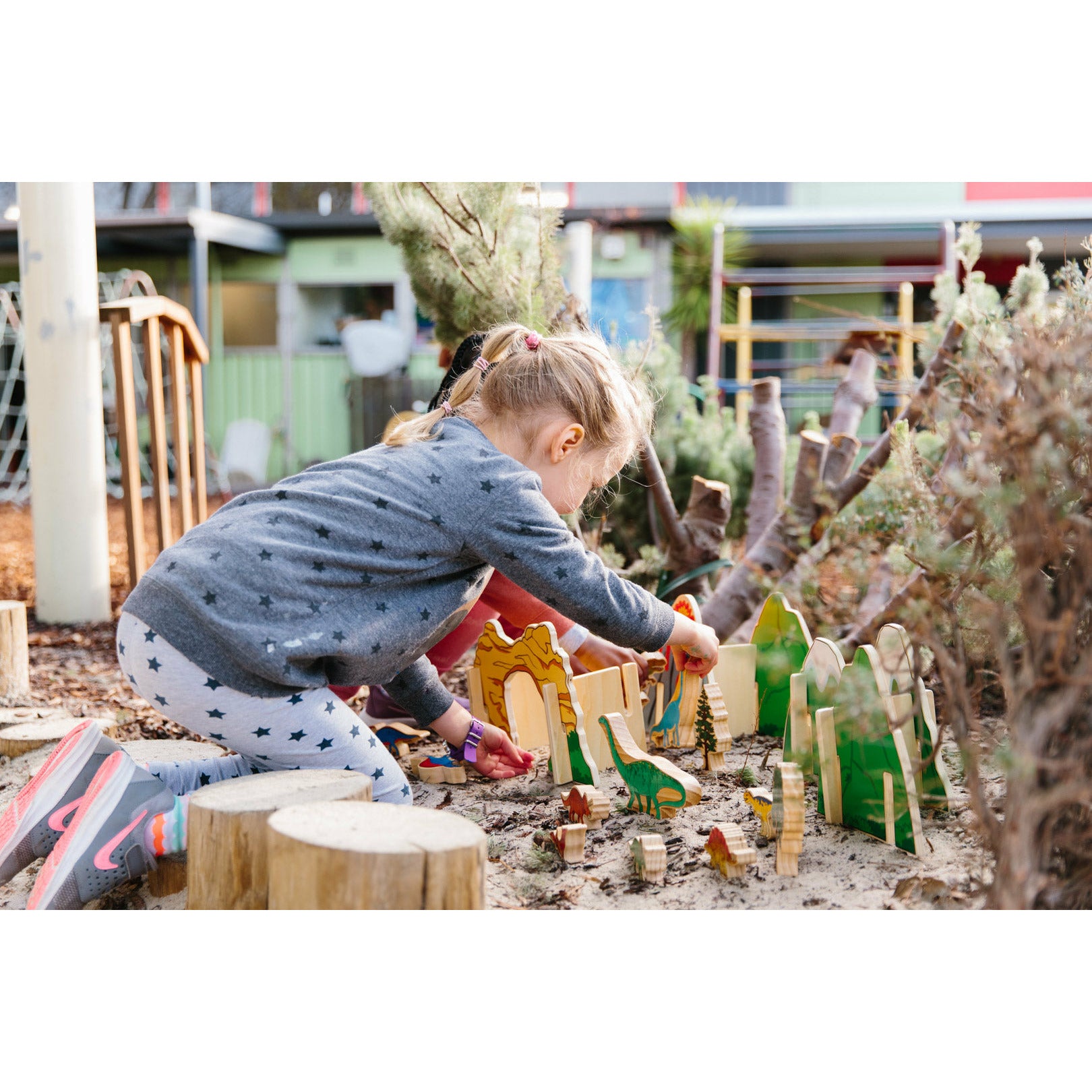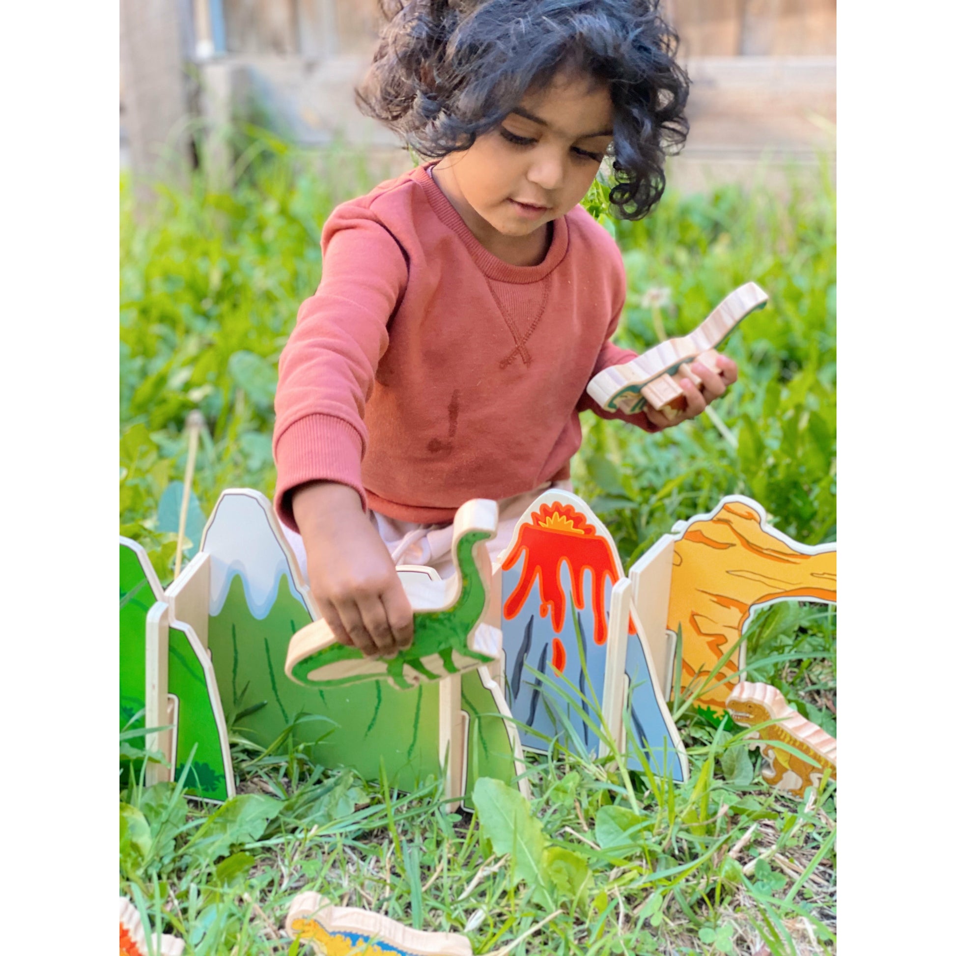 Watch the dinosaurs come alive with this colourful prehistoric small world wooden set that includes 10 dinosaurs favourites (T-Rex, Triceratops, Spinosaurus and Brachiosaurus to name a few). This set comes complete with a prehistoric landscape of mountains, a volcano, trees and cliffs with a cave. Your young adventurer’s imagination will be running wild role-playing while developing emotional and language skills. The beautifully illustrated images are printed using non-toxic heat transfer technology and sealed with a clear matte varnish to ensure they stay vibrant for years to come.