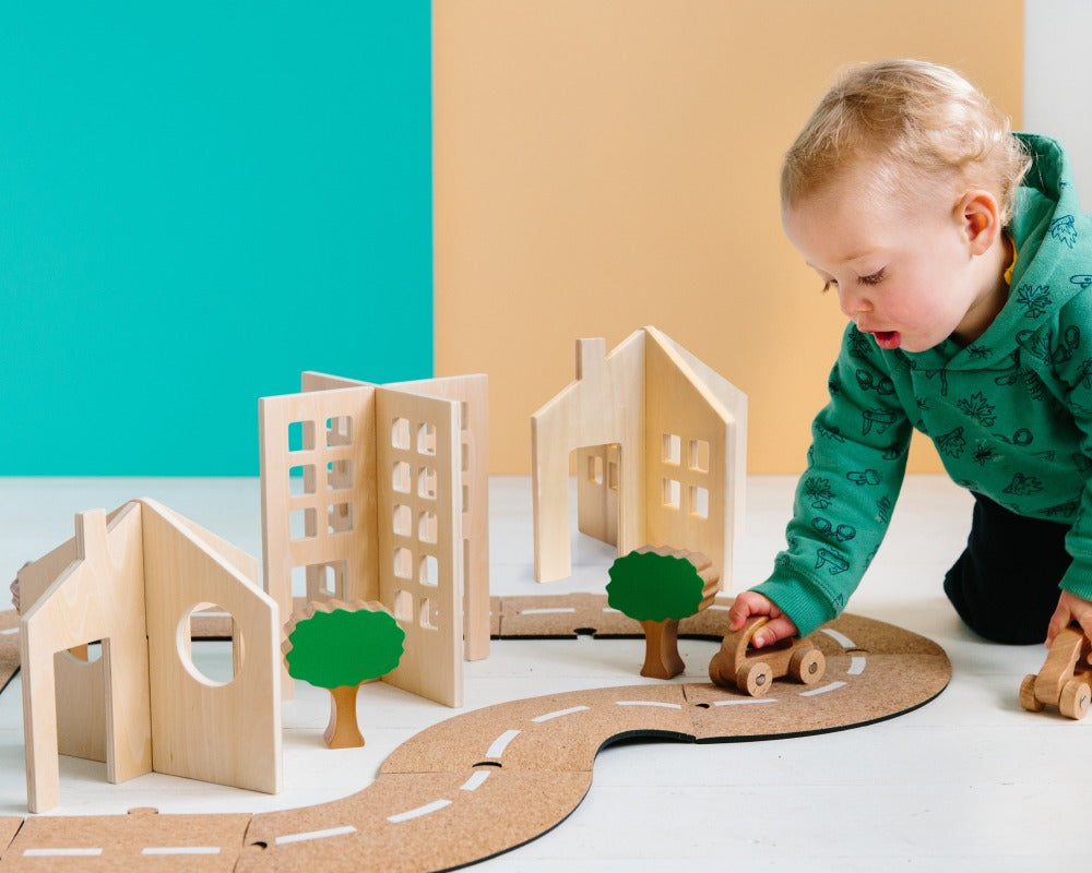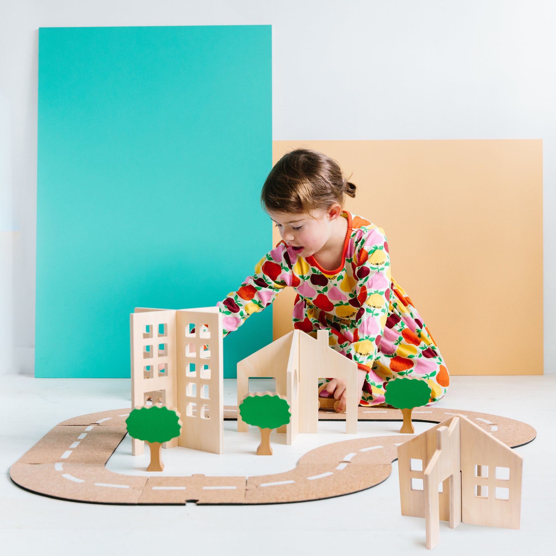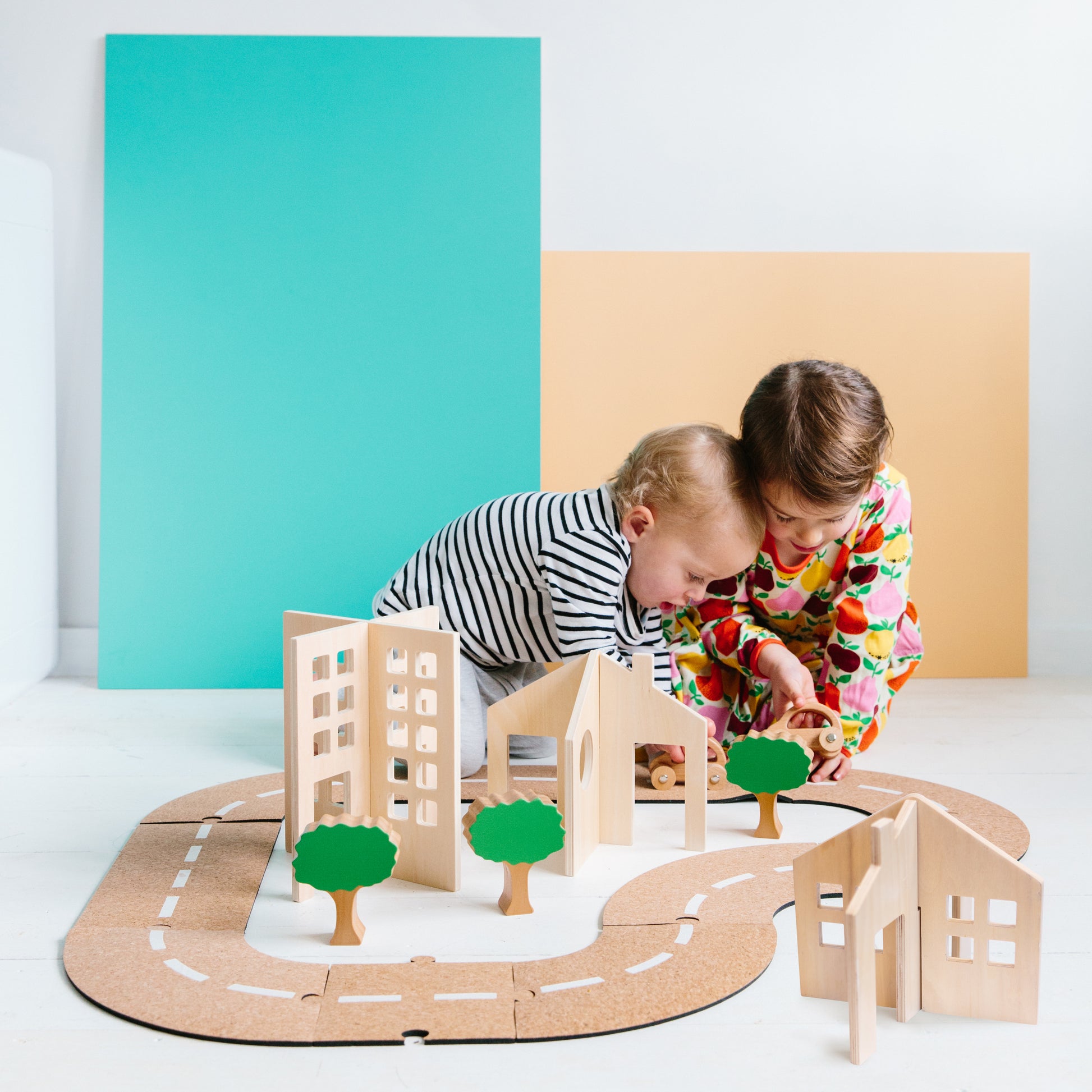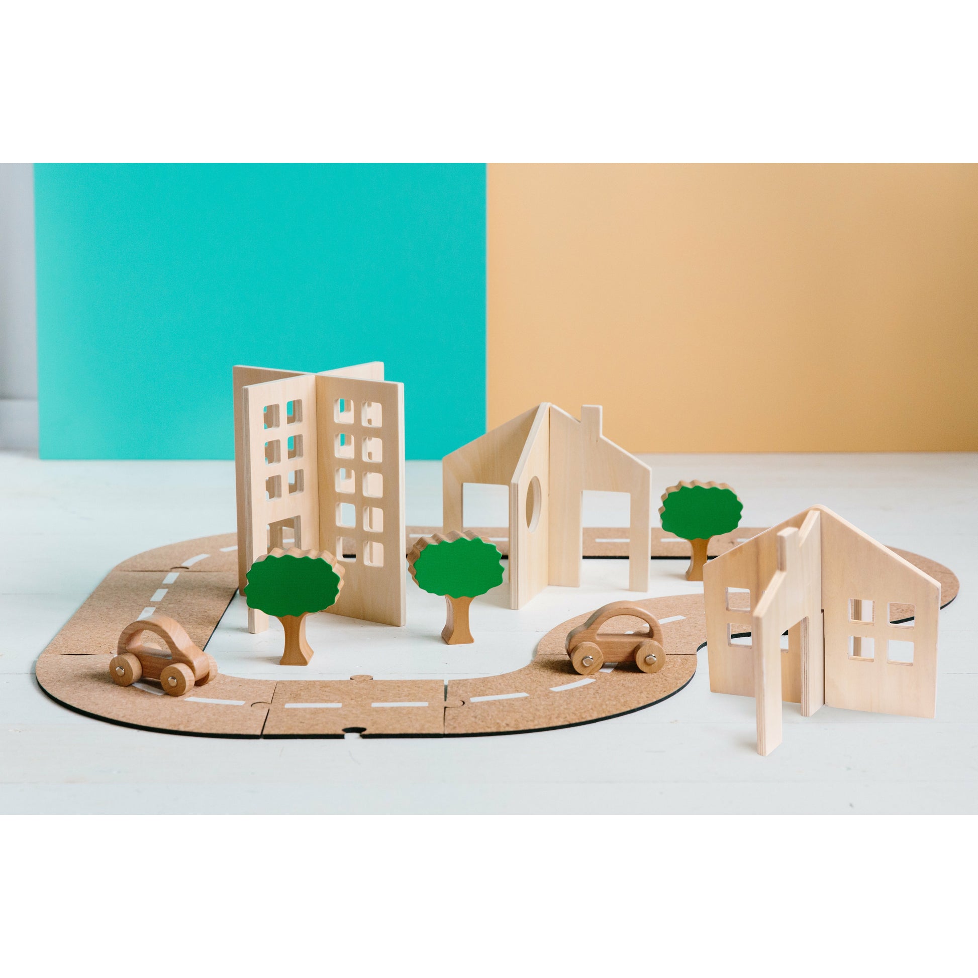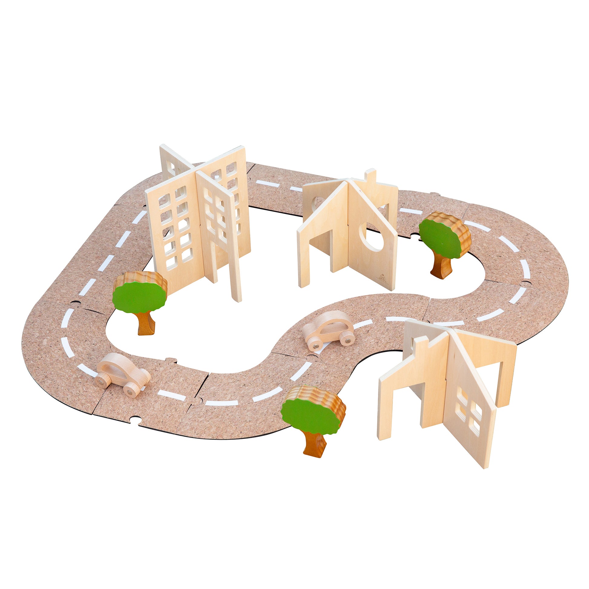 - The roads are made from natural rubber/cork and wooden pieces are a combination of FSC New Zealand pine, plywood and beech wood.