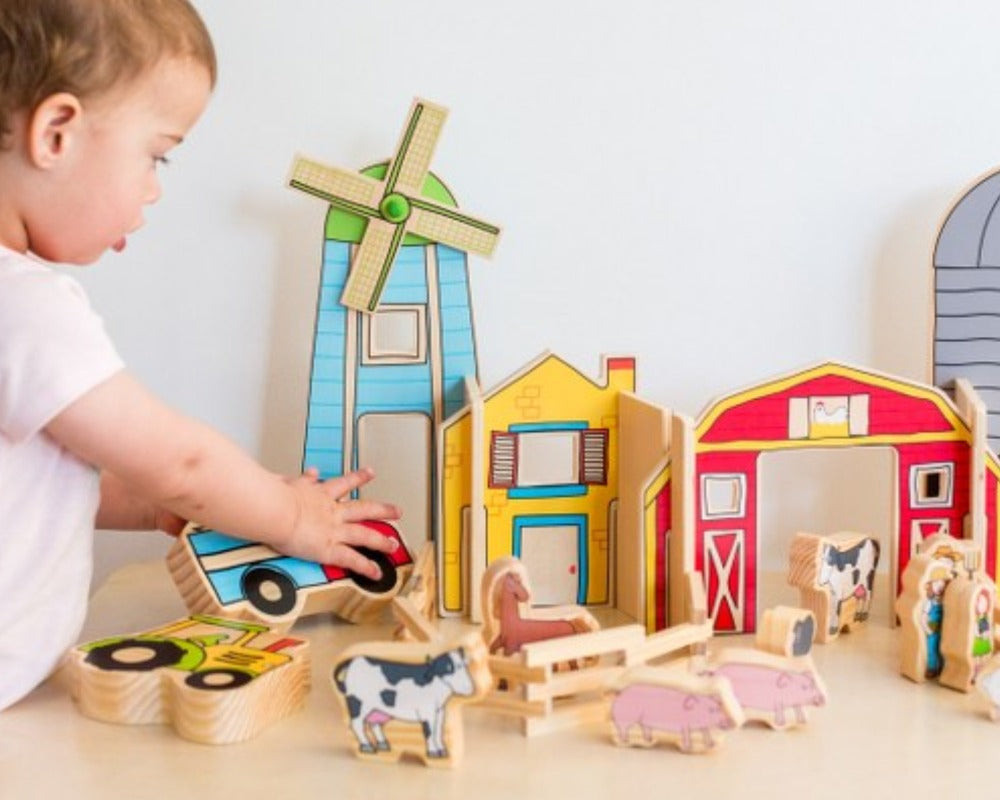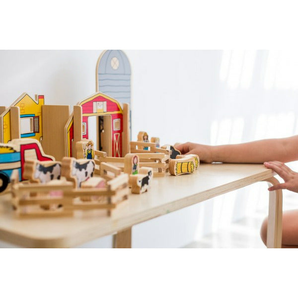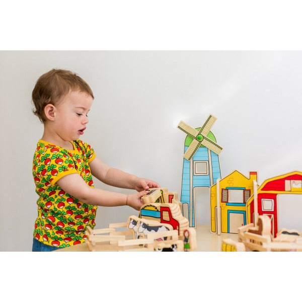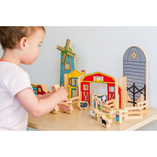 This Happy Architect Farm set includes a moving windmill, a farming family, tractor, truck, fences, a red barn and a whole lot of farm animals. This 26 pieces wooden set encourages your child to use their imagination which also aids in social and emotional development as they immerse in pretend play. The beautifully illustrated images are printed using non-toxic heat transfer technology and sealed with a clear matte varnish to ensure they stay vibrant for years to come.